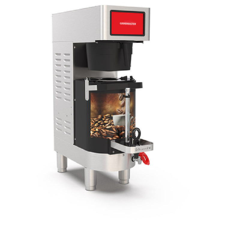 The Grindmaster Cecilware PBC-1W GRINDMASTER Beverage (LV606057) PrecisionBrew™ Warmer Shuttle® Coffee Brewer is a sophisticated single brewer designed for use with a 1.5-gallon Shuttle® system. It comes with a stand (WS15, warmer), making it a versatile addition to any commercial coffee brewing setup. This brewer is equipped with an intuitive touchscreen featuring a digital interface, allowing for precise control over brewing parameters. It accommodates three distinct brew volumes, ensuring flexibility to meet various brewing demands. The Grindmaster Cecilware PBC-1W is cULus certified, which highlights its compliance with safety standards, while the NSF certification assures its suitability for use in environments requiring rigorous hygiene standards. The warmer shuttles and graphics are available for purchase separately, allowing for customization based on specific aesthetic and functional needs. This coffee brewer is an excellent choice for cafes, restaurants, and other food service establishments that require reliable coffee brewing equipment with advanced technology and flexibility. Its design and features cater to different market segments within the beverage industry, providing a high-performance solution for professional coffee brewing needs.