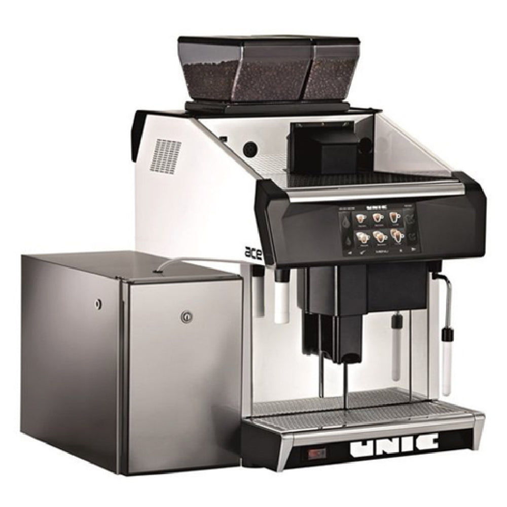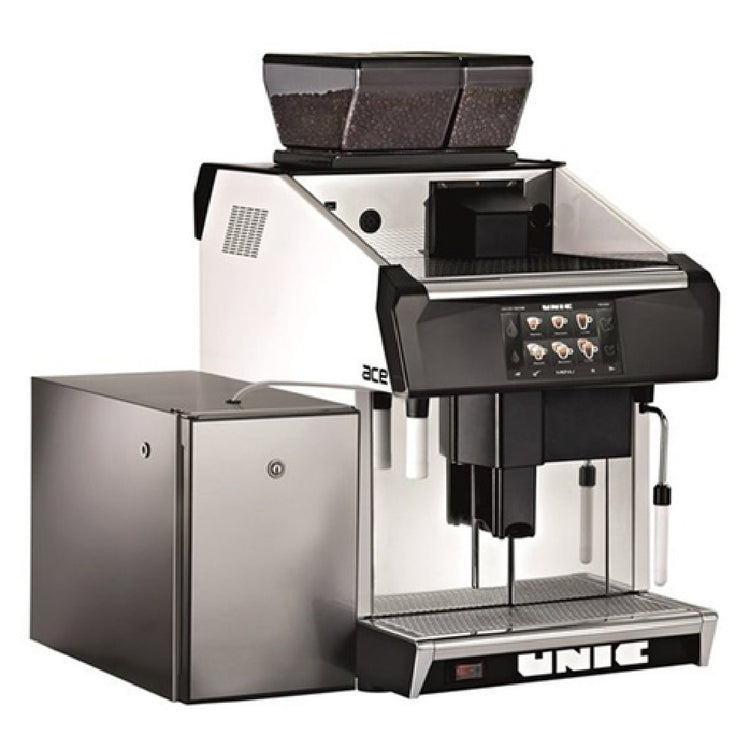 The Grindmaster Cecilware TACEM GRINDMASTER Beverage (LV602741) UNIC Tango Ace Milk Espresso Machine is an advanced super-automatic espresso solution tailored for high-demand environments. With a substantial 6.5-liter boiler capacity and capable of processing upwards of 25 lbs of coffee per week, this machine is engineered for efficiency and durability. It features dual bean hoppers with capacities of 3.75 lbs and 2.6 lbs, respectively, complemented by two grinders equipped with 64mm Mahlkonig burrs for precise grinding. The machine boasts a stainless steel brewing chamber and a Teflon steam wand, further enhancing its robust build. Its touch screen display offers 48 programmable and customizable icon recipes, allowing for diverse beverage options. Temperature regulation for steam and group ensures optimal brewing, while eight infusion parameters provide flexibility in flavor extraction. For convenience, the espresso machine includes a telescopic dismountable double coffee spout and a programmable hot water dispenser. Safety and maintenance are prioritized with features like a large waste bin with overfill safeguard, a drink counter, and day/night mode. The inclusion of a full-sized rotary vane pump and stainless steel panels underscores its industrial-grade design. Notably, a milk refrigerator is not included, offering customizable setup options. This unit operates on 208v/60/1-ph, 6120 watts, and 30 amps, and is certified by cCSAus and NSF.