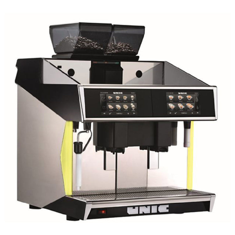 The Grindmaster Cecilware TDST Grindmaster Beverage (LV602748) UNIC Tango ST Duo Espresso Machine is a cutting-edge, super-automatic espresso maker designed for high-volume commercial environments. It features two groups and a SteamAir wand with an automated milk foamer, capable of handling upwards of 48 lbs of espresso per week. The machine boasts two 6.5-liter boilers and two bean hoppers, each with a capacity of 3.75 lbs, supported by two grinders with 80mm Mahlkonig burrs for optimal coffee preparation. With its 60,000 cycle piston seals and independent stainless steel brewing chambers, this machine promises durability and consistency. The Tango ST Duo offers 48 programmable and customizable icon recipes, a touch screen display, and nine infusion parameters, allowing for precise temperature regulation across steam, coffee, and group settings. Additional features include independent steam and coffee boilers, telescopic dismountable double coffee spouts, a programmable hot water dispenser, a large waste bin with an overfill safeguard, and day/night mode settings. Constructed with stainless steel panels and a steel framework, it includes a full-sized rotary vane pump and adjustable LED lighting. Operating at 208v and 8700 watts with 50 amps, this model comes with cleaning tablets, lubricant, control cards, and necessary plumbing components, meeting cCSAus and NSF standards.