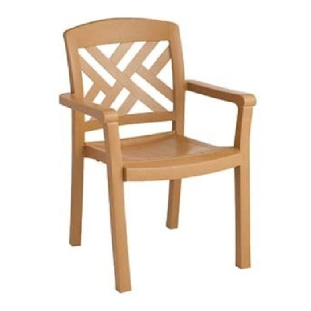 The Grosfillex 45451408 Sanibel Classic Stacking Dining Armchair is a remarkable piece designed specifically for outdoor use, combining functionality with a classic aesthetic. Crafted with Rexform® resin, this armchair features a synthetic wood texture finish that closely resembles teakwood, offering a sophisticated look without the maintenance needs of real wood. Made in the USA, this chair is a testament to high-quality craftsmanship and durability. Its stackable design allows for easy storage, making it an excellent choice for both commercial and residential settings where space efficiency is a priority. The Grosfillex Sanibel Classic is sold individually but packed in cases of 12, catering to bulk purchase needs typical of hospitality businesses, such as restaurants and hotels, seeking to furnish patios or outdoor dining areas with stylish, weather-resistant seating. This chair's robust construction ensures it withstands the rigors of outdoor environments while maintaining its elegant appearance, making it a valuable addition to any outdoor furniture collection.