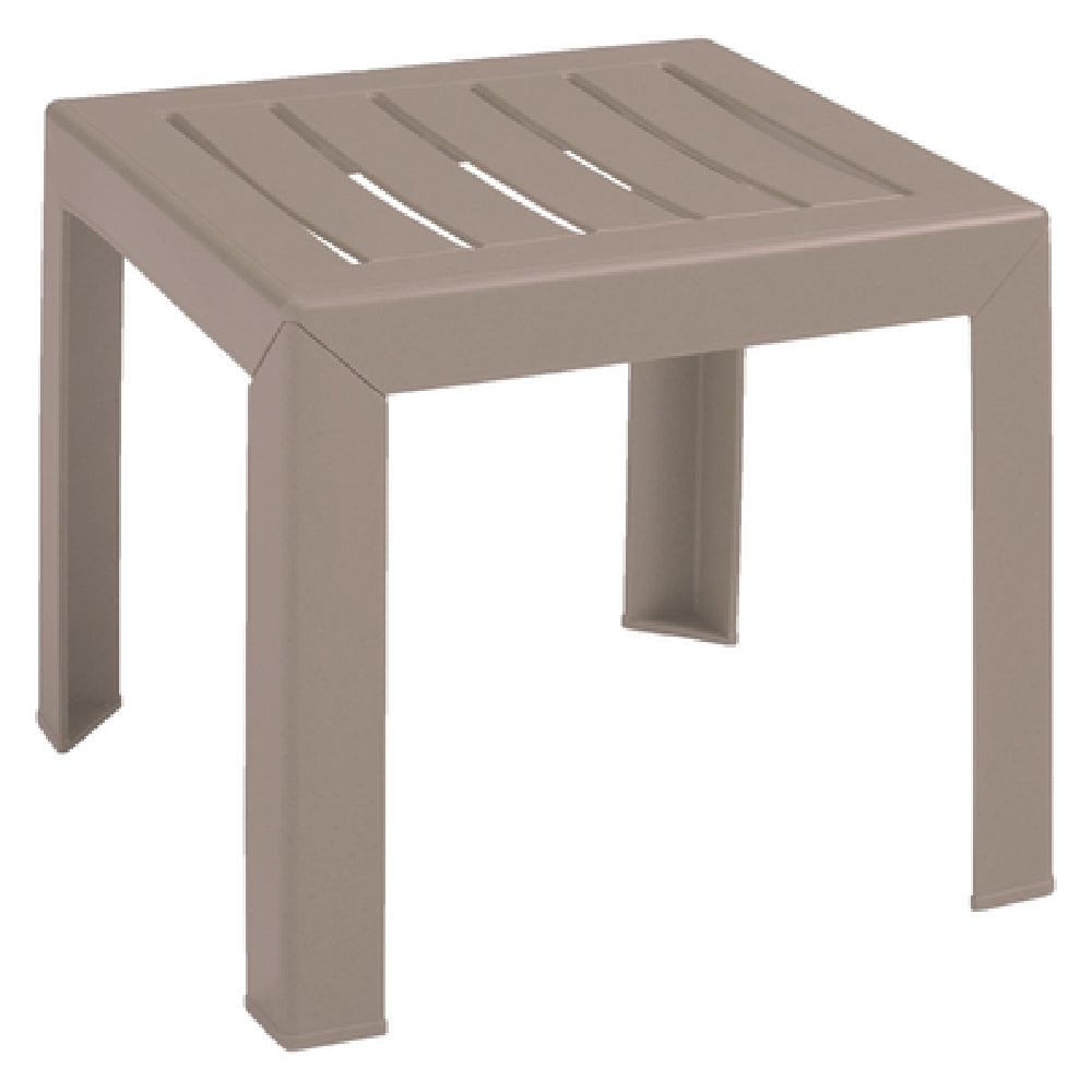The Grosfillex CT052181 Bahia Outdoor Low Table 16" x 16" Square is an ideal piece for various outdoor settings, combining durability and style with practical design. This sturdy table features a slatted top, promoting efficient water drainage and adding a sleek, modern aesthetic. Crafted from UV-resistant resin, it is designed to withstand prolonged exposure to sunlight, preventing fading and maintaining its French taupe color over time. This durability makes it an excellent choice for residential patios, commercial outdoor dining spaces, or poolside areas, where consistent exposure to the elements is a consideration. Proudly made in France, the table reflects high-quality European manufacturing standards, ensuring longevity and reliable performance in diverse weather conditions. Its compact 16" x 16" square dimensions allow it to fit seamlessly into smaller spaces, making it suitable for both intimate settings and larger, more expansive outdoor arrangements. The Grosfillex CT052181 Bahia Outdoor Low Table is packed individually, simplifying logistics and storage. This product is particularly valuable for hospitality sectors seeking stylish and enduring outdoor furniture solutions, delivering a balance of form and function that caters to various market segments within the industry.