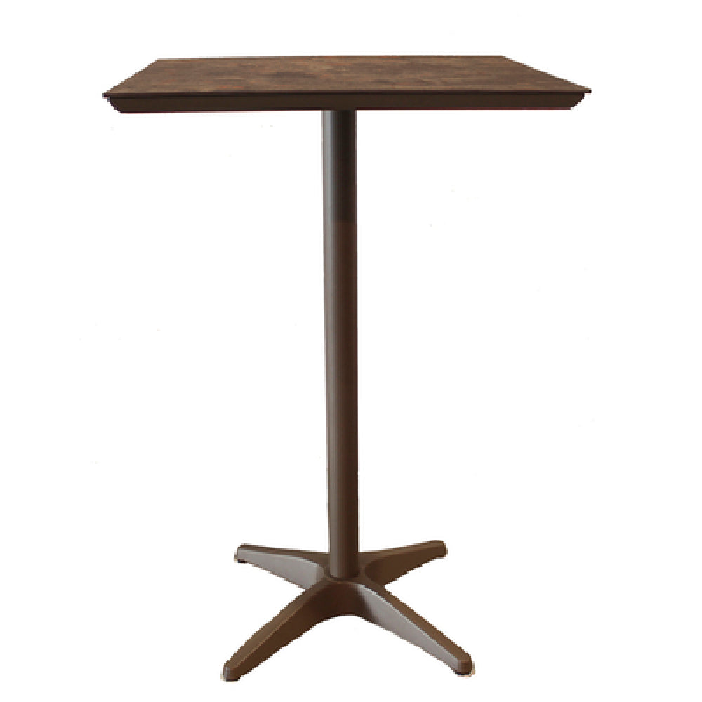 The Grosfillex U3402599 Sunset Outdoor Table is a high-quality square table designed for outdoor use, with dimensions of 28 inches by 28 inches and a height of 42 inches, making it bar height. Its top is crafted from high-pressure laminate, ensuring durability and resistance to various elements, while the fusion bronze aluminum base with a satin finish adds an elegant touch. This table is equipped with leg levelers and nylon footpads to provide stability and protect surfaces, even on uneven ground. Additionally, the Grosfillex U3402599 is rust and UV resistant, making it a reliable choice for outdoor settings. Manufactured in France, this table is packed as one unit, offering a sleek yet functional design that appeals to both residential and commercial outdoor spaces. The combination of these features makes it a valuable addition to patios, cafes, and bars, where both aesthetic and durability are paramount.