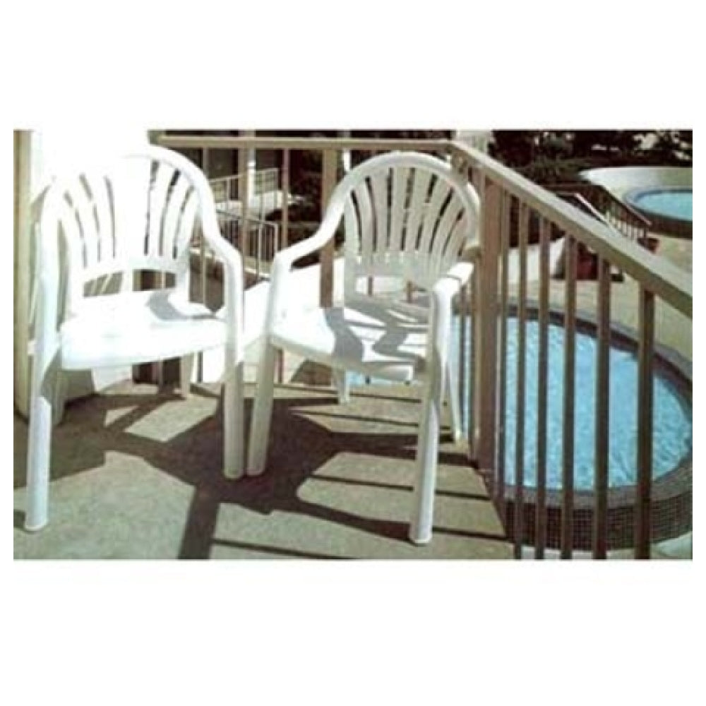 The Grosfillex US092004 Pacific Fanback Stacking Armchair is a versatile outdoor seating solution tailored to meet the needs of various market segments. Crafted from one-piece molded UV-resistant resin, it offers robust durability against the elements, ensuring long-lasting use in outdoor settings. The high gloss finish in white adds a touch of elegance, making it suitable for both residential patios and commercial hospitality spaces. Manufactured in the USA, this chair is testament to quality craftsmanship. Its design facilitates easy storage and transport, as it is stackable, allowing multiple chairs to be conveniently stored together - packed by 4 each per case. This feature is particularly advantageous for businesses such as cafes, resorts, and event venues, where space optimization is crucial. The Grosfillex US092004 chair's ergonomic fanback design provides comfort for extended periods, enhancing customer satisfaction in any setting. Its sturdy construction ensures that it can support various body types while maintaining aesthetic appeal. Ideal for use in environments that prioritize both functionality and style, this armchair seamlessly blends form and practicality, making it an essential addition to any outdoor seating arrangement. This chair is engineered to withstand the rigors of outdoor use, providing a reliable seating option across diverse market applications.
