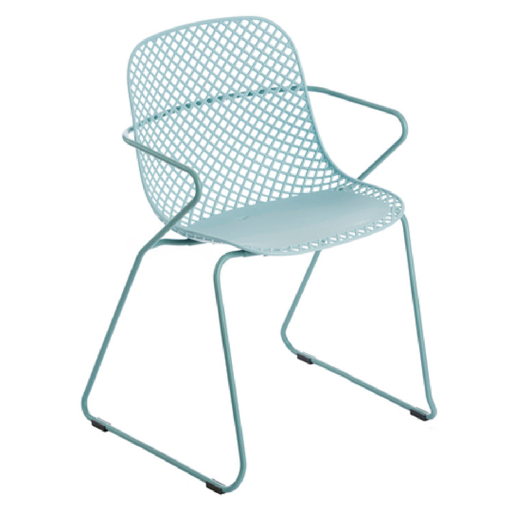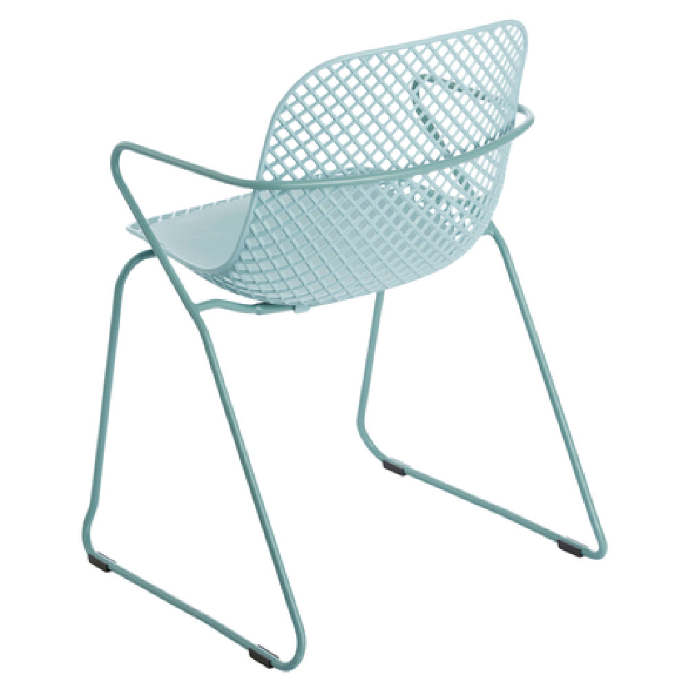 The Grosfillex US137711 Ramatuelle '73 Armchair is a versatile seating solution, integrating style and practicality with its stackable design. Crafted with a lattice design resin back and a solid resin seat, this chair combines durability and comfort. The powder-coated steel legs enhance its robustness, ensuring stability for various settings. This armchair is UV and weather resistant, making it suitable for both indoor and outdoor environments. It meets the ASTM standards, confirming its quality and safety for diverse applications. The chair is presented in a striking blue ether color, adding a touch of elegance to any space. Manufactured in China, this model is discontinued, with limited stock available, providing a unique opportunity to acquire a distinctive piece. Packaged in sets of four per case, the Ramatuelle '73 Armchair is an ideal choice for hospitality venues, event spaces, or residential settings seeking a blend of aesthetic appeal and functional design. Its stackable feature ensures easy storage and efficient use of space, catering to dynamic environments that require flexible furniture solutions. The Grosfillex Ramatuelle '73 Armchair delivers a compelling combination of style, durability, and versatility for various market segments.