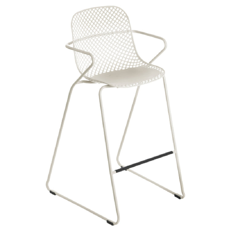 The Grosfillex US139710 Ramatuelle '73 Barstool Stackable Lattice Design Resin Back is a versatile seating solution designed for both indoor and outdoor environments. It features a distinctive lattice design on the resin back, coupled with a solid resin seat, providing both style and durability. The powder-coated steel legs add stability, while the integrated footrest enhances comfort. This barstool is stackable, making it easy to store and manage space efficiently. The material composition ensures it is UV and weather resistant, with ASTM rating assuring quality and safety standards. Available in a sophisticated creme absolut finish, the Grosfillex US139710 is manufactured in China and is currently discontinued, with limited stock available, making it an exclusive choice for those seeking a unique piece. Each case includes two barstools, making it suitable for a range of market segments, from commercial hospitality settings such as restaurants and bars to residential patios and balconies. Its design and durability cater to various aesthetic and functional needs, providing both practical and elegant seating solutions for diverse spaces.