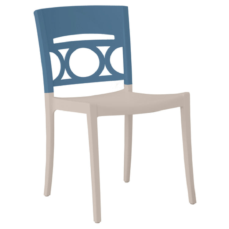 The Grosfillex US566680 Moon Stacking Side Chair is a versatile piece of outdoor furniture designed with both aesthetics and functionality in mind. Featuring a distinctive circular moon design resin back, this chair adds a touch of modern elegance to any outdoor setting. The chair's resin seat and frame are crafted for durability, ensuring it withstands various weather conditions, making it an ideal choice for patios, gardens, and other outdoor spaces. This environmentally-conscious product is recyclable, aligning with sustainable practices. The denim blue frame paired with a linen finish provides a sophisticated color palette that complements a wide range of decor styles. Though discontinued, limited stock is available, offering a unique opportunity for those seeking exclusive furnishings. Each case includes four chairs, providing ample seating for gatherings. Proudly made in the USA, this chair meets ASTM standards, confirming its quality and safety, making it suitable for commercial or residential use. Its stacking feature allows for easy storage, enhancing its practicality for venues needing to optimize space. The Grosfillex Moon Stacking Side Chair combines sleek design, robust construction, and environmental mindfulness, making it a valuable addition to any outdoor furniture collection.
