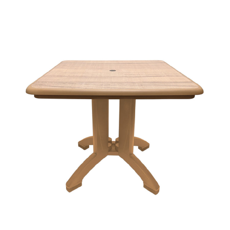 The Grosfillex US744008 Aquaba Outdoor Table, 32" x 32" square, is a meticulously designed piece of outdoor furniture, combining functionality with aesthetic appeal. This table features a sawcut tabletop that provides a distinct texture and visual interest. An umbrella hole with a cap increases its versatility, making it suitable for shaded outdoor settings. The table is supported by teakwood legs, renowned for their durability and resistance to outdoor elements, adding a natural elegance to its design. Constructed with UV-resistant resin, the table ensures longevity by withstanding the harsh effects of sunlight, making it a perfect choice for various outdoor environments. Proudly made in the USA, each unit is packed two per case, ensuring efficient storage and transportation. The Grosfillex US744008 Aquaba Outdoor Table is ideal for both residential and commercial use, offering a perfect balance of style, durability, and practicality for patios, gardens, restaurants, or any outdoor seating area. Its thoughtful design and quality materials make it a valuable addition to any setting, catering to the needs of different market segments within the outdoor furniture industry.