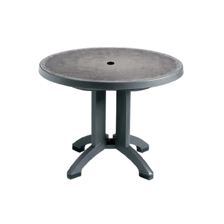 The Grosfillex US921002 Aquaba Outdoor Table is a versatile and durable addition to any outdoor setting, crafted with a 38-inch diameter round zinc table top that is both stylish and functional. This table features an umbrella hole complete with a cap, offering flexibility for shaded arrangements, ideal for patios, cafes, or poolside lounging. Complemented by charcoal legs, its aesthetic appeal is matched with robust support, while the UV resistant resin construction ensures lasting durability against sun exposure. Proudly made in the USA, the Aquaba table stands out for its resilience and design, catering to various market segments including hospitality venues and residential outdoor spaces. This product's thoughtful engineering, including the protective features and quality materials, highlights its unique value proposition as a premium choice for outdoor furniture that combines functionality with a sophisticated appearance.
