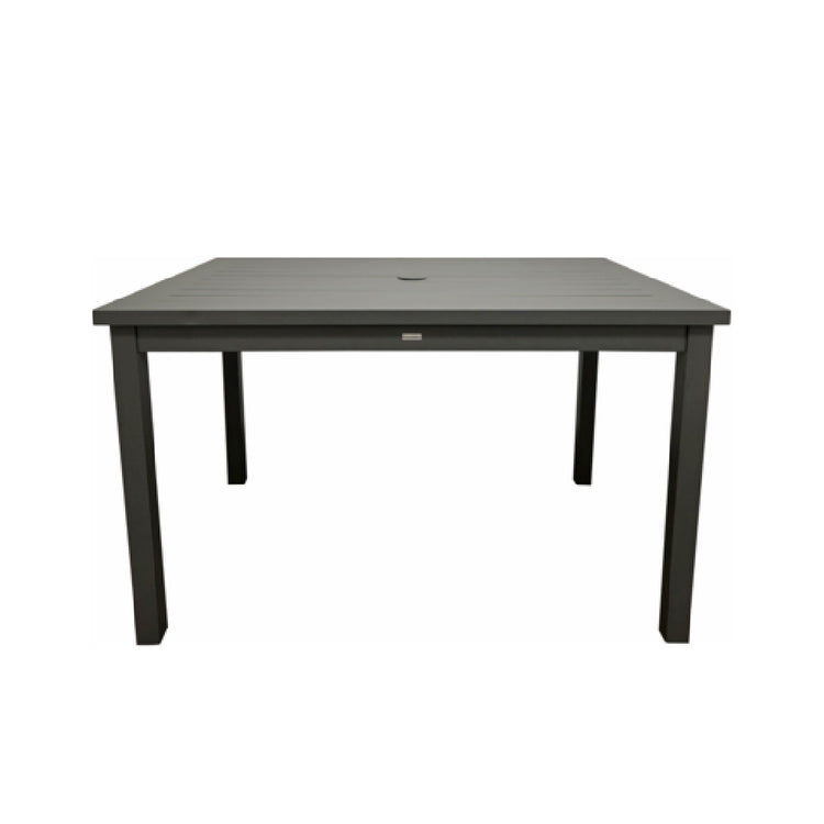 The Grosfillex US929288 Sigma Complete Outdoor Table 48" x 34" x 29-1/3"H Square is a versatile and stylish addition to any outdoor setting. This slatted aluminum table is designed with precision and functionality, featuring four corner legs equipped with adjustable levelers to ensure stability on uneven surfaces. Its square shape and dimensions make it suitable for various outdoor spaces, from residential patios to commercial hospitality venues. The inclusion of an umbrella hole with a plug allows for easy integration of shade solutions, enhancing user comfort. Manufactured with a textured finish in Volcanic Black, this table is both UV resistant and aesthetically pleasing, ensuring durability and a sleek appearance over time. The Grosfillex table ships complete, simplifying the setup process for users. Made in China, this product combines practicality with modern design, catering to diverse market segments within the outdoor furniture industry. Its robust construction and functional features make it a valuable asset for environments seeking both elegance and resilience in their outdoor furniture choices.