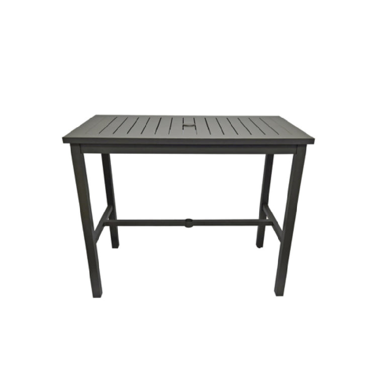 The Grosfillex US931288 Sigma Complete Outdoor Table is a rectangular table measuring 51 inches by 28 inches and stands at a bar height of 42 inches, making it a versatile choice for various outdoor settings. This table is constructed from slatted aluminum, providing a durable and lightweight design that is resistant to the elements. It features four corner legs equipped with adjustable levelers, ensuring stability on uneven surfaces. An added convenience is the umbrella hole with a plug, offering flexibility for different weather conditions. The table's UV-resistant properties protect it from sun damage, maintaining its aesthetic appeal over time. The textured finish in Volcanic Black enhances its visual appeal, making it suitable for settings ranging from casual patios to upscale outdoor dining areas. Manufactured in China, the table ships complete, ensuring a straightforward setup. This table is ideal for businesses in the hospitality industry, such as restaurants and bars, that require functional yet stylish outdoor furniture solutions. Its robust design and practical features make it a valuable addition to any outdoor space, catering to the needs of both commercial and residential markets.
