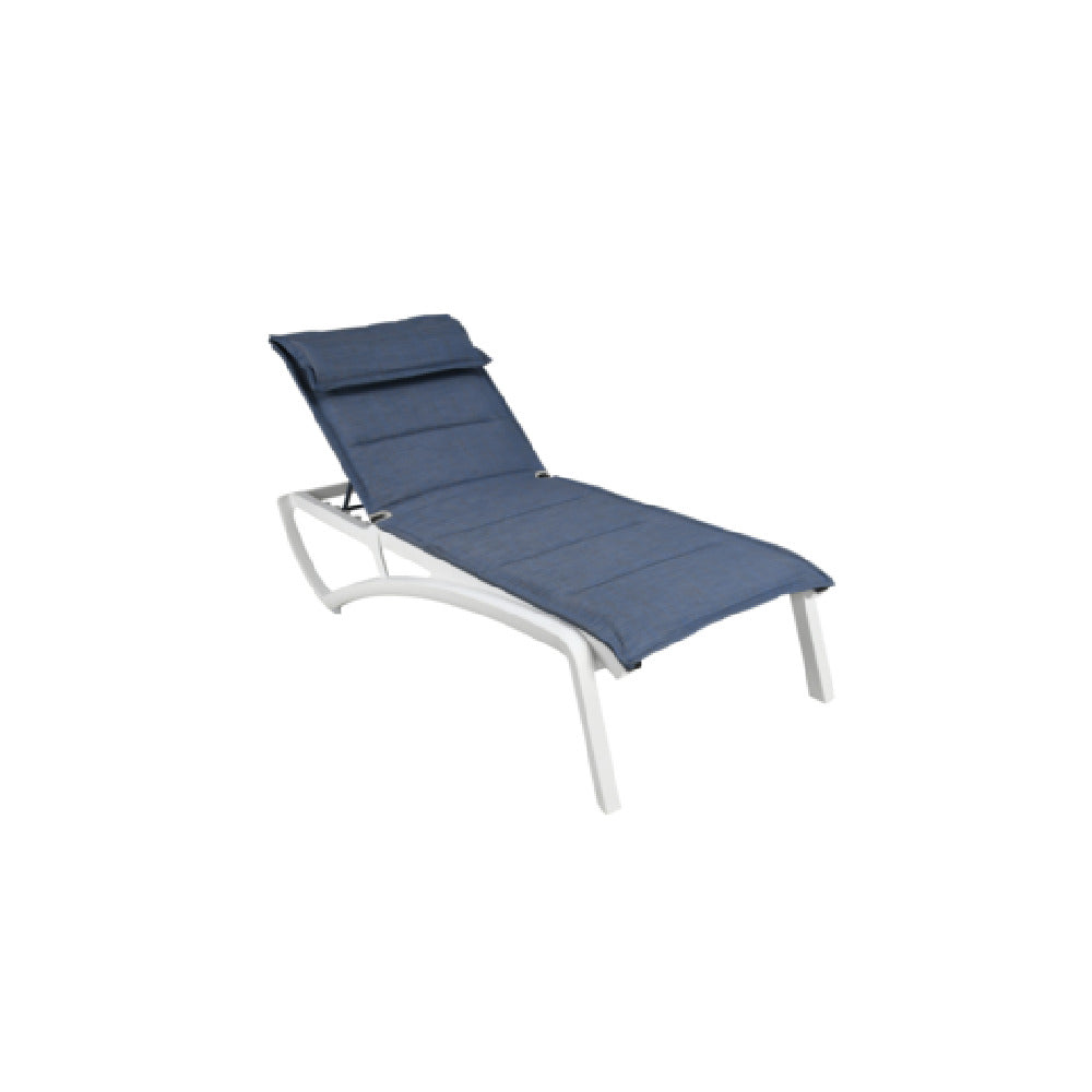 The Grosfillex UT074096 Sunset Comfort Chaise Lounge Stackable Without Arms is designed to meet the diverse needs of hospitality, commercial, and residential spaces. This chaise lounge features a textilene fabric sling treated with Microban® anti-microbial technology, ensuring long-lasting cleanliness and hygiene. Constructed with air molding technology resin, it boasts exceptional durability and resilience, being both UV and rust-resistant. The chaise lounge is power washable, which simplifies maintenance, making it convenient for high-traffic areas. This ASTM-rated product underscores its quality and safety standards. Its glacier white frame and madras blue fabric create a stylish and modern aesthetic, ideal for poolside settings and recreational environments. The design includes recessed wheels, enhancing mobility for effortless positioning and storage. With its stackable capability, this product is practical for facilities requiring quick and efficient space optimization. Additionally, it is recyclable, supporting sustainability initiatives. Manufactured in the USA, the Grosfillex UT074096 Sunset Comfort Chaise Lounge is packaged at 12 per case, catering to bulk procurement needs. Its combination of functional design, robust materials, and aesthetic appeal makes it a strategic choice for operators seeking reliable outdoor furniture solutions.