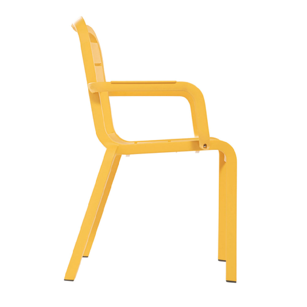 The Grosfillex UT115737 Cannes Stacking Armchair is a versatile piece of furniture that seamlessly fits both indoor and outdoor environments, owing to its robust, weather-resistant construction. Crafted in the USA, this chair is designed with a contoured shape and features a slotted resin back, providing ergonomic comfort and support. Its construction comprises a durable resin seat and frame, ensuring longevity and ease of maintenance. The chair's standout feature is its UV resistance, making it ideal for outdoor use without the worry of color fading or material degradation from sun exposure. Additionally, its recyclable materials emphasize an eco-friendly design, appealing to environmentally conscious consumers. Rated by ASTM for quality assurance, this armchair comes in a vibrant yellow color that adds a pop of brightness to any setting. The Grosfillex UT115737 is conveniently stackable, allowing for efficient storage and space management, especially in hospitality settings like cafes, restaurants, and event venues. Packed by 16 per case, it is a practical choice for businesses requiring bulk seating solutions. Its blend of durability, comfort, and style makes it an attractive option for a variety of market segments, from residential to commercial applications.