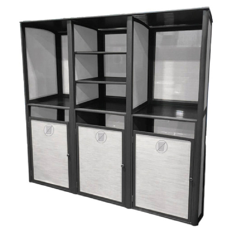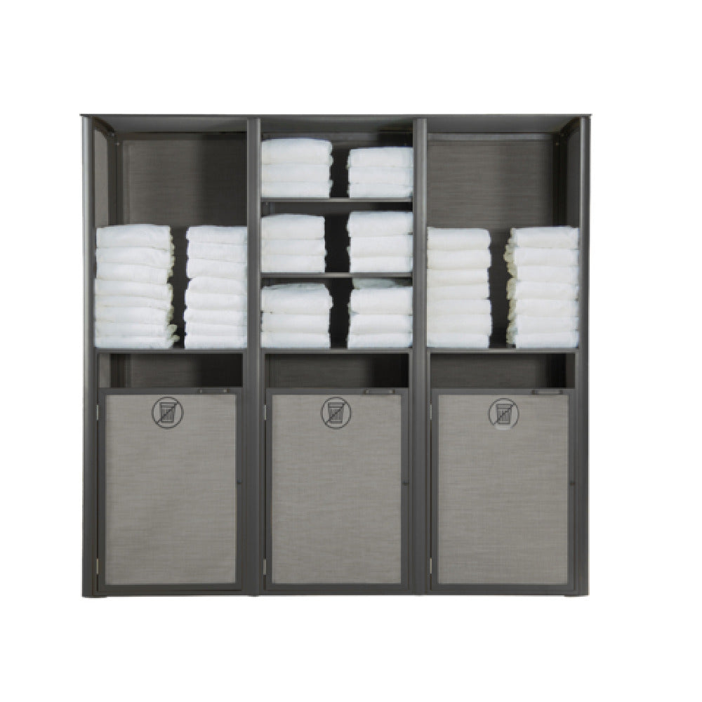 The Grosfillex UT174288 Sunset Towel Valet Triple Unit is an elegantly designed and highly functional storage solution, measuring 73 inches wide, 25 inches deep, and 70 inches high. It features three integrated laundry carts with coordinating bags, providing ample space for towel storage and management. This versatile unit is equipped with two removable shelves, enhancing its adaptability for both indoor and outdoor applications. Crafted from durable aluminum with textilene fabric inserts, it showcases a volcanic black frame paired with solid gray fabric, which not only adds a touch of sophistication but also ensures UV and weather resistance. Made in China, the Grosfillex UT174288 is an ideal choice for hospitality venues, poolside areas, and recreational facilities, where robust, weather-resistant towel storage is essential. Its ability to withstand variable weather conditions makes it a reliable option for outdoor usage, while its sleek design allows for seamless integration into indoor environments. This towel valet is packed efficiently, arriving as a single unit, ensuring ease of installation and immediate implementation in your facility. With its combination of practical features and stylish design, the Grosfillex UT174288 serves as a valuable asset in maintaining an organized and efficient towel service operation.
