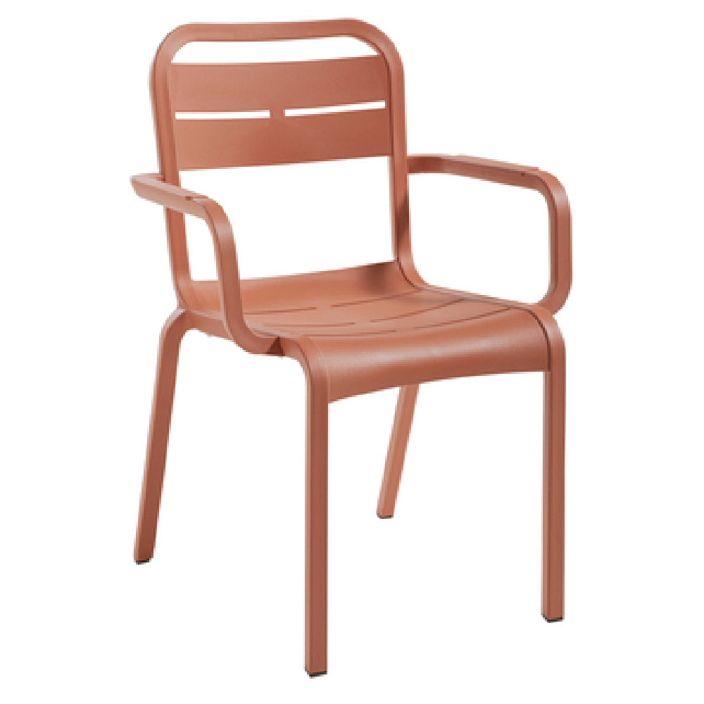 The Grosfillex UT511814 Cannes Stacking Armchair is a versatile seating solution designed for both indoor and outdoor environments, offering a blend of functionality and style. This armchair is meticulously crafted with a contoured design to provide optimal comfort, making it suitable for various settings such as patios, dining areas, and social gatherings. The slotted resin back, along with the durable resin seat and frame, ensures longevity and resilience against various weather conditions. A standout feature is its UV resistance, safeguarding the chair's vibrant terra cotta color from fading, which is especially beneficial for outdoor use. The recyclable materials used in its construction reflect an environmentally conscious approach, aligning with sustainable practices. Certified with the ASTM rating, the Grosfillex UT511814 meets rigorous industry standards for safety and quality, making it a reliable choice for commercial and residential use alike. Proudly manufactured in the USA, this armchair comes packed in sets of four per case, offering convenience for bulk purchases. Its stacking capability not only facilitates easy storage but also maximizes space efficiency, catering to the needs of businesses in the hospitality industry or homeowners seeking practical yet stylish seating options.