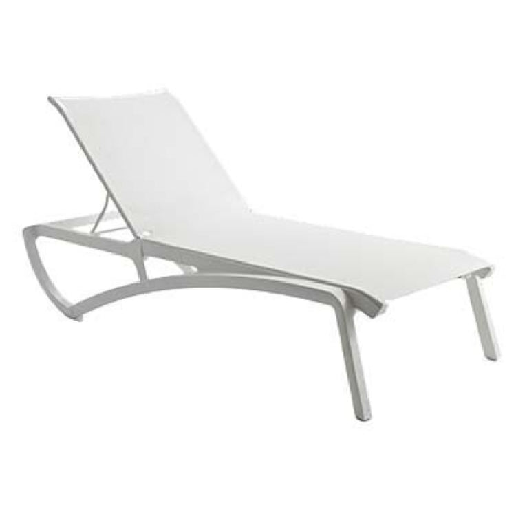 The Grosfillex UT740096 Sunset Chaise Lounge Stackable Without Arms is designed for both durability and ease of maintenance, making it an ideal choice for various professional environments such as hotels, resorts, and poolside settings. Constructed with air molding technology resin, this chaise lounge offers strength and resilience, ensuring longevity. The textilene fabric sling is treated with Microban® anti-microbial treatment, which provides an additional layer of hygiene, crucial for high-traffic usage. Its glacier white frame complements the white fabric, presenting a sleek and modern aesthetic. The chaise lounge is ASTM rated, attesting to its superior performance and safety standards. It is UV and rust resistant, making it suitable for outdoor use, maintaining its appearance and structural integrity over time. Power washable and recyclable, this product supports sustainable practices. The recessed wheels enhance mobility, allowing for easy repositioning without the need for additional equipment. Made in the USA, each case contains 12 units, making it efficient for bulk purchasing. This stackable chaise lounge maximizes space efficiency, an essential feature for facilities aiming to streamline their storage capabilities while providing comfortable and stylish seating options for their guests.