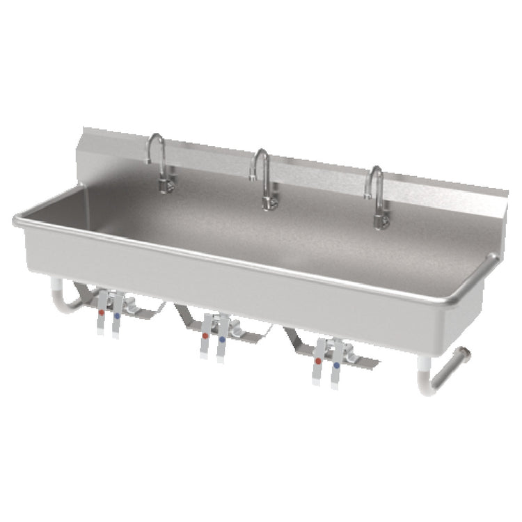 GSW USA, ACE-MWS-1860K, Hands Free Multi Station Sink, wall mount, 60"W x 14" front-to-back x 8" deep bowl, 18/304 stainless steel, 8" high backsplash with (3) faucet with gooseneck spout, (3) knee action operation valve with color indexed pedals for hot & cold, tubular wall brackets, ETL
