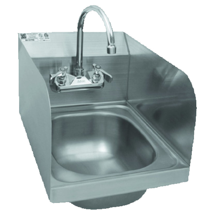 GSW USA, HS-1217S, Hand Sink, wall mount, one compartment, 12-5/8"W x 17-7/8"D x 13-3/8"H overall size, 9-3/4" wide x 13-3/4" front-to-back x 5-5/8" deep sink bowl, welded splash guards, includes: no lead wall mount gooseneck faucet (AA-410G) & strainer (AA-141), wall mount bracket, 304 stainless steel construction, ETL