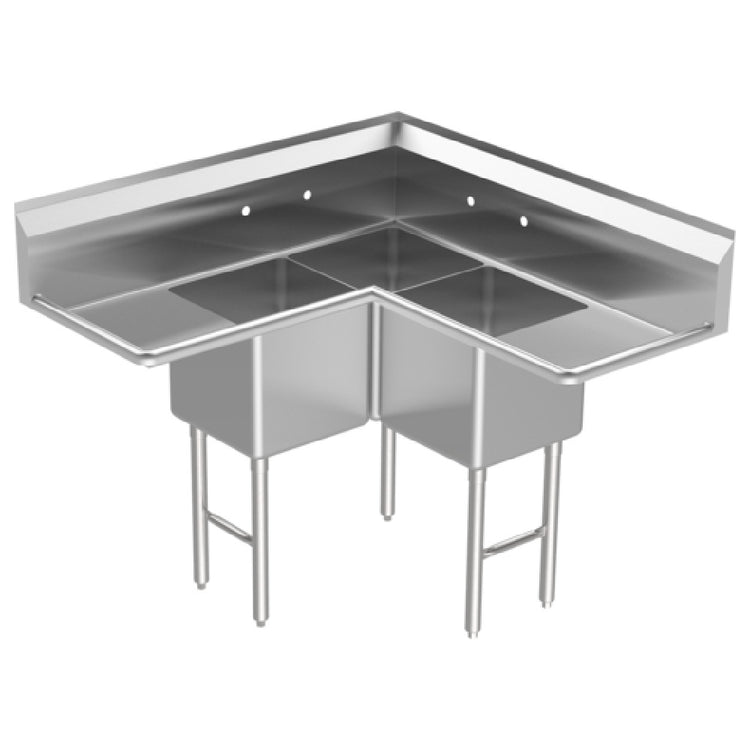 GSW USA, SE15153C, Corner Sink, three compartment, 45"W x 45"D x 45"H, 18-gauge stainless steel construction, 15" x 15" x 12" deep compartments, 15" drainboards on left & right, 11-1/2"H backsplash, (2) sets of 8" OC splash mount faucet holes, includes (3) strainers with 3-5/8" dia. openings, stainless steel legs & side cross bracing, ETL