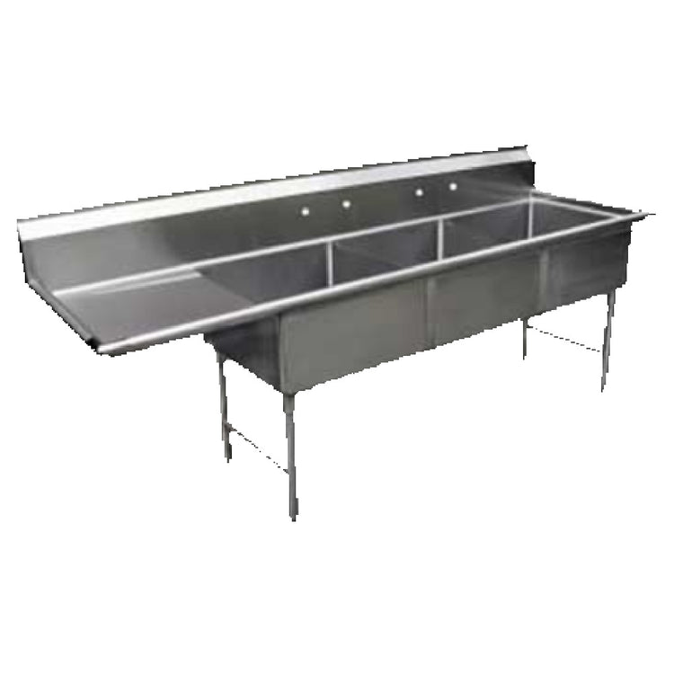 GSW USA, SH24243L, Sink, three compartment, 99-3/8"W x 30"D x 45"H, 16-gauge stainless steel construction, 24" x 24" x 14" deep compartments, 24" drainboard on left, 11-1/2"H backsplash, (2) sets of 8" OC splash mount faucet holes, includes (3) strainers with 3-5/8" dia. openings, stainless steel legs & side cross bracing, ETL