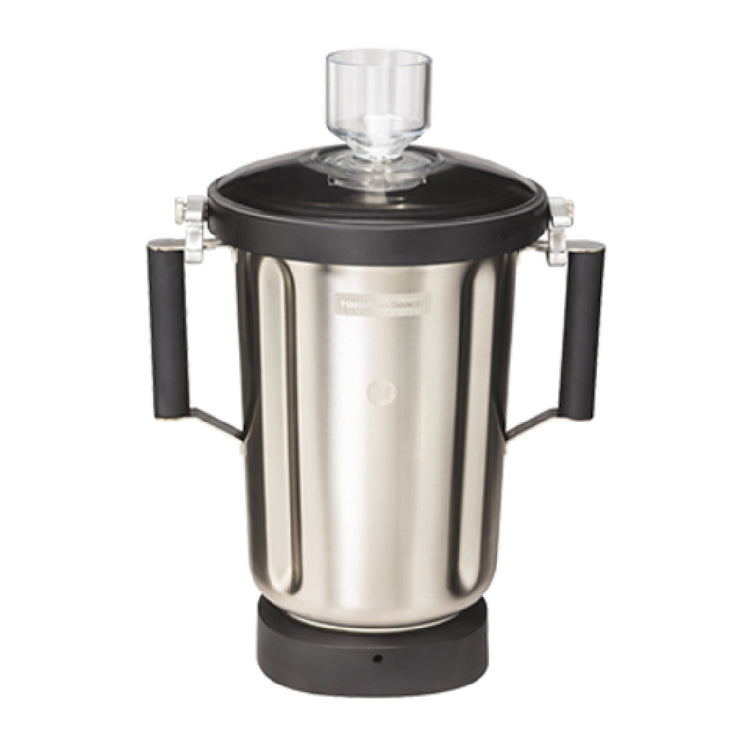 The Hamilton Beach 6126-1100SR Blender Container is a robust and versatile tool designed to meet various professional blending needs. With a substantial capacity of 135-1/5 ounces (4 liters), this container is ideal for high-volume food service establishments that require efficient blending solutions. It features convenient double handles, allowing for secure handling and effortless pouring, which is particularly beneficial in fast-paced kitchen environments. The clear lid is equipped with a dosing cup, enabling precise measuring and adding of ingredients without removing the lid, streamlining the preparation process. Constructed from durable stainless steel, the container ensures longevity and resistance to wear, maintaining its performance in demanding commercial settings. The Hamilton Beach 6126-1100SR is specifically compatible with models HBF1100 and HBF1100S, integrating seamlessly into existing setups for those models. This blender container is NSF certified, highlighting its adherence to rigorous health and safety standards, ensuring it meets the stringent requirements of professional kitchens. Its thoughtful design and substantial capacity make it a valuable asset for various segments within the food and beverage industry, from restaurants and cafes to catering services, emphasizing efficiency and reliability in high-demand scenarios.