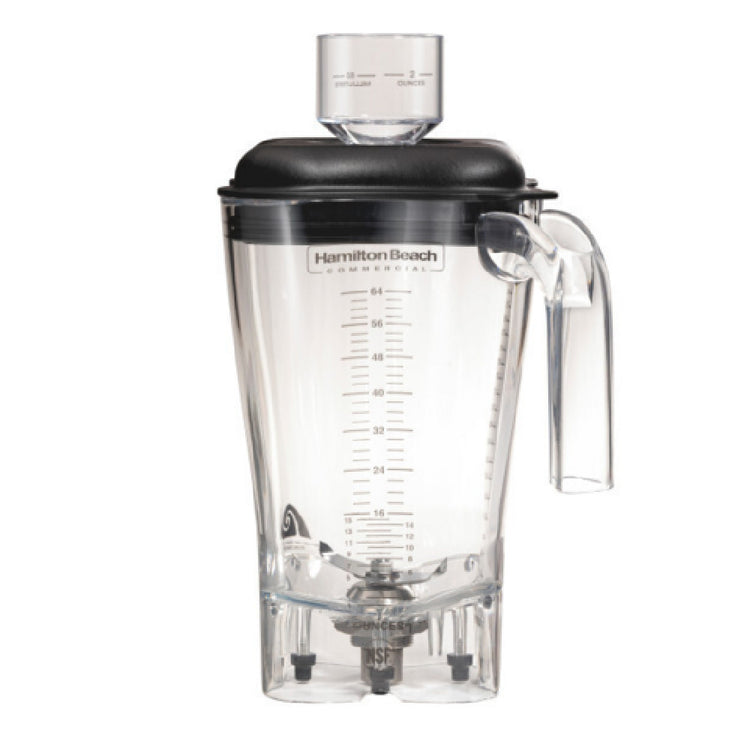 The Hamilton Beach 6126-HBF600R Blender Container - 64 oz. with Cutting Assembly is a robust and versatile accessory designed specifically for the Expeditor™ HBF600 and HBF600R series blenders. With a generous capacity of 64 ounces, this container is crafted from BPA-free copolyester, ensuring safety and durability. Its stackable design maximizes storage efficiency, making it ideal for bustling commercial kitchens or cafes with limited space. The cutting assembly, included with the container, ensures seamless blending performance, whether you are preparing smoothies, soups, or sauces. Additionally, the container is equipped with a lid and dosing cup, facilitating precision in measuring and adding ingredients during the blending process. The Hamilton Beach 6126-HBF600R Blender Container offers a reliable and high-capacity solution for culinary professionals across various segments, from restaurants and cafes to catering services, who demand consistency and quality in their food preparation processes.