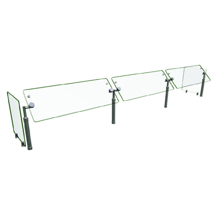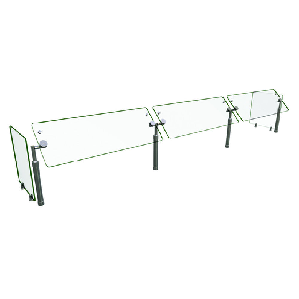 The Hatco B950-120 Flav-R-Shield® B950 Food Shield stands as a testament to precision engineering in the realm of food service equipment. This adjustable self-service unit features three bays with dimensions of 120"W x 18"D x 23"H, making it a spacious option for various culinary environments. Constructed entirely with heat-tempered glass, it boasts 3/4" radius corners and polished edges, enhancing both safety and aesthetics. The glass front and side panels are 3/8" thick, providing robust protection and durability. The structure is supported by 1" OD brushed 304 stainless steel posts, ensuring stability and longevity. A unique feature of this food shield is its adjustable face panel, which can be rotated in 15-degree increments, offering flexibility for different presentation angles. This product is NSF certified, attesting to its compliance with rigorous safety and sanitation standards. Proudly made in the USA, the Hatco B950-120 is engineered for use in diverse markets such as hospitality, catering, and food retail, providing a reliable solution for maintaining hygiene and display standards.