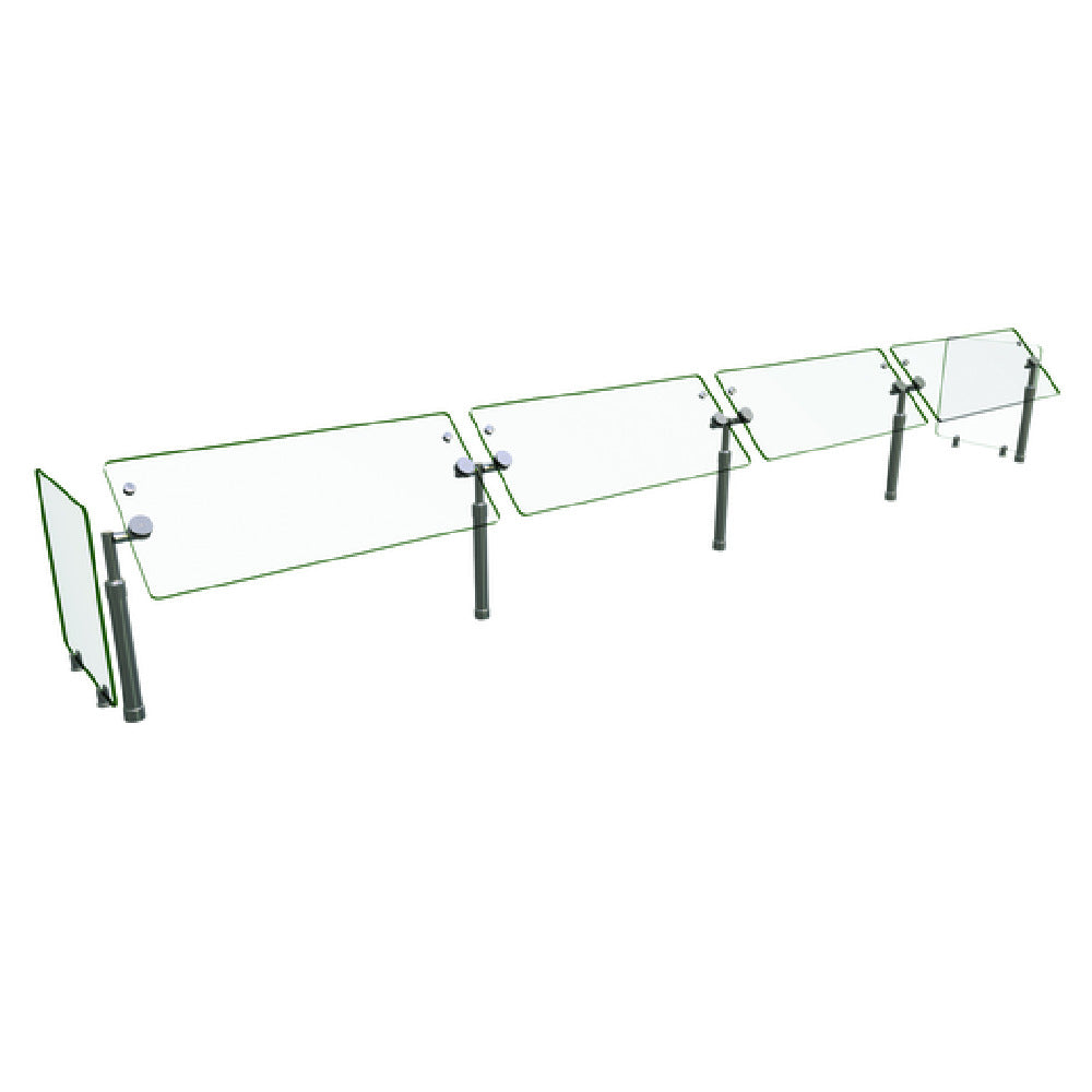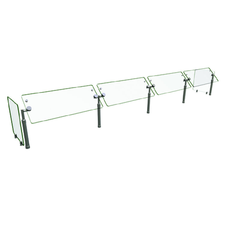 The Hatco B950-144 Flav-R-Shield® B950 Food Shield is an adjustable self-service unit designed for optimal functionality and durability in various food service settings. This model features four bays and measures 144 inches wide, 18 inches deep, and 23 inches high, providing ample coverage for self-service operations. Constructed entirely from heat-tempered glass, it ensures both resilience and transparency, with 3/8-inch thick glass panels on the front and sides, complemented by 3/4-inch radius corners and polished edges for a sleek finish. The unit is supported by 1-inch OD brushed 304 stainless steel posts, known for their strength and corrosion resistance. A key feature of this food shield is its adjustable Face Panel, allowing for rotation in 15-degree increments, enabling customization for different service needs. Certified as an NSF component, the Hatco B950-144 complies with public health standards, ensuring safety and sanitation in food service environments. Proudly made in the USA, this food shield combines quality construction with functional design, meeting the needs of a diverse range of food service markets, from cafeterias to buffet setups, with its blend of practicality and aesthetic appeal.