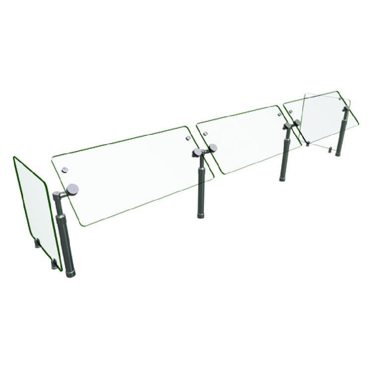 The Hatco B950SWIVEL-96 Flav-R-Shield® B950SWIVEL Food Shield Adjustable Self-service is a meticulously designed unit tailored for efficient food service operations. It features a substantial size with dimensions of 96 inches in width, 18 inches in depth, and 23 inches in height, making it suitable for various self-service environments. Constructed with heat-tempered glass throughout, this food shield ensures durability and resilience, incorporating 3/4-inch radius corners and polished edges for a sleek appearance. The glass front and side panels are 3/8 inches thick, enhancing its sturdy construction. Supported by 1-inch OD brushed 304 stainless steel posts, the food shield ensures stability and longevity. The adjustable face panel rotation is a standout feature, allowing adjustments in 15-degree increments, which provides flexibility and adaptability in service settings. The bracket heads on the face swivel from 90 degrees up to 270 degrees, accommodating turns when utilizing multiple bays. Proudly made in the USA, this food shield is an NSF component, ensuring it meets public health and safety standards. The Hatco B950SWIVEL-96 is a versatile and reliable choice for any professional setting that demands both style and functionality in food presentation.