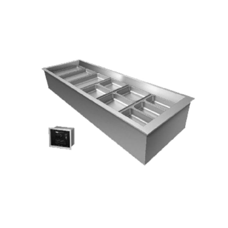 The Hatco CWBX-3 Drop-In Refrigerated Well - 3 Pan Size Top Mount is a versatile refrigeration solution engineered for seamless integration into a variety of food service operations. This unit accommodates three full-size pans, supported by sturdy pan support bars, making it ideal for buffets and catering environments where maintaining optimal food temperatures is crucial. Equipped with electronic temperature control, this well ensures precise thermal management, while the auto defrost feature minimizes maintenance efforts. The remote refrigeration system, along with the TXV valve, which is shipped loose, optimizes cooling efficiency. The unit's stainless steel bezel and aluminized steel housing provide durability and a polished appearance, enhancing its aesthetic appeal in any setting. Designed without a condensing unit, it offers flexibility for customized refrigeration solutions. Additionally, the 1-inch drain and comprehensive insulation contribute to effective drainage and thermal retention. The Hatco CWBX-3's control panel, shipped separately, allows for straightforward installation and operation. Certified by cULus and proudly made in the USA, this drop-in refrigerated well stands as a practical and reliable choice for industry professionals seeking to enhance their food service capabilities with high-quality refrigeration technology.