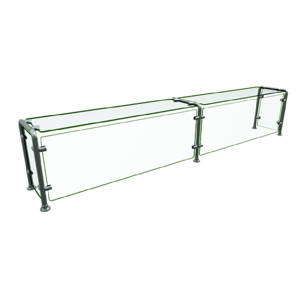 Hatco EP12-08412 Flav-R-Shield® EP12 Food Shield Full Service Pass-over 2 Bays 84"W x 12"D x 18"H is an exemplary unit designed for efficient food service operations, enhancing both functionality and aesthetic appeal. This product features a robust construction using 1/4" thick heat-tempered glass with 3/4" radius corners and polished edges, ensuring durability and safety. The glass top shelf offers a sleek appearance, while the front and side panels coupled with back post provide comprehensive protection and visibility. It stands on 1" OD brushed 304 stainless steel posts, promising stability and a modern look. This food shield is NSF certified, indicating adherence to rigorous health and safety standards, making it especially suitable for busy commercial environments such as restaurants, catering services, and buffets where hygiene and food safety are paramount. Crafted in the USA, Hatco EP12-08412 not only guarantees a high-quality manufacturing standard but also supports domestic production. Its design efficiently caters to establishments requiring a sturdy and reliable pass-over station, providing an excellent solution for maintaining food presentation while ensuring protection. With its impressive dimensions and build quality, this food shield is an ideal investment for any business aiming to optimize its service efficiency and product safety.