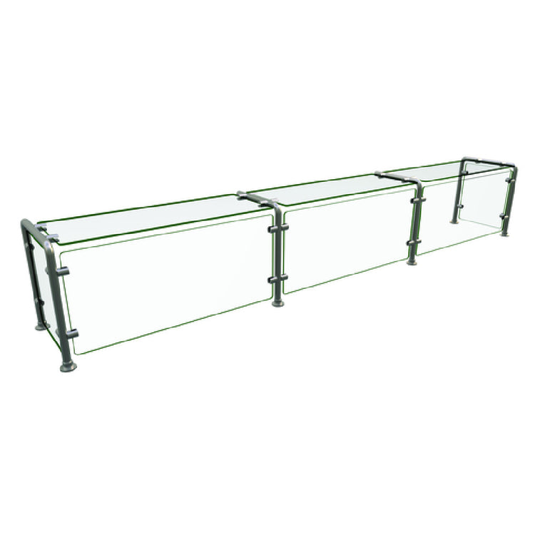The Hatco EP12-09615 Flav-R-Shield® EP12 Food Shield is a precision-engineered solution designed for full service pass-over applications in a variety of food service settings. Measuring 96 inches in width, 15 inches in depth, and 18 inches in height, its construction is distinguished by the use of 1/4-inch thick heat-tempered glass, ensuring safety and durability. This model features 3/4-inch radius corners and polished edges, enhancing both the aesthetic appeal and safety of the unit. A glass top shelf, along with front and side panels, are supported by back posts constructed from 1-inch OD brushed 304 stainless steel, known for its resistance to corrosion and excellent durability. The food shield is NSF certified, highlighting its adherence to strict public health and safety standards, and it is proudly made in the USA, assuring quality and reliability. This product is particularly suitable for various segments within the food service industry, such as cafeterias, buffets, and self-service stations, offering a robust and transparent protective barrier between food and customers while maintaining an elegant presentation. Its meticulous design and use of premium materials make the Hatco EP12-09615 Flav-R-Shield® an essential asset for maintaining food safety and presentation excellence in service areas.