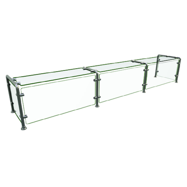 The Hatco EP12-09618 Flav-R-Shield® EP12 Food Shield is a meticulously designed full-service pass-over unit, ideal for safeguarding food in high-traffic environments. This three-bay structure measures 96 inches wide, 18 inches deep, and 18 inches high, offering ample space for various food display needs. Constructed with 1/4-inch thick heat-tempered glass, it ensures durability and clarity, allowing clear visibility of the displayed items. The glass is designed with 3/4-inch radius corners and polished edges for added safety and elegance. The unit features a glass top shelf, along with front and side panels supported by back posts, ensuring comprehensive protection. It is reinforced with 1-inch OD brushed 304 stainless steel posts, providing both stability and a sleek aesthetic. As an NSF component, it meets rigorous public health standards, making it a reliable choice for maintaining hygiene in food service settings. Proudly made in the USA, the Hatco EP12-09618 Flav-R-Shield® EP12 Food Shield stands out as a superior option for restaurants, cafeterias, and catering services looking to enhance their food presentation while ensuring safety and compliance with industry standards.