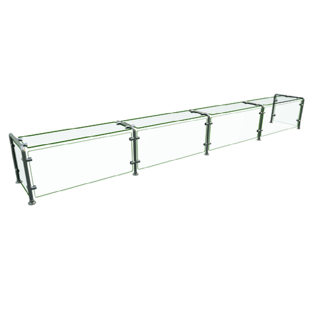 The Hatco EP12-13218 Flav-R-Shield® EP12 Food Shield is a highly specialized full-service pass-over unit, designed to meet the demanding needs of the foodservice industry. This meticulously crafted food shield features four bays with dimensions of 132 inches in width, 18 inches in depth, and 18 inches in height, offering ample coverage for various food display and service settings. The construction utilizes 1/4 inch thick heat-tempered glass, ensuring durability and safety, complemented by 3/4 inch radius corners and polished edges for a sleek, modern aesthetic. A glass top shelf and front as well as side panels supported by back posts provide additional functionality and style. The 1-inch outer diameter brushed 304 stainless steel posts not only add to the overall durability but also contribute to a professional appearance. As an NSF component, the Hatco EP12-13218 adheres to stringent health and safety standards, making it a reliable choice for environments where quality and compliance are paramount. Proudly made in the USA, this food shield is an invaluable asset for restaurants, hotels, and catering services that require a robust and stylish solution for food presentation and protection, ensuring both customer satisfaction and operational efficiency.
