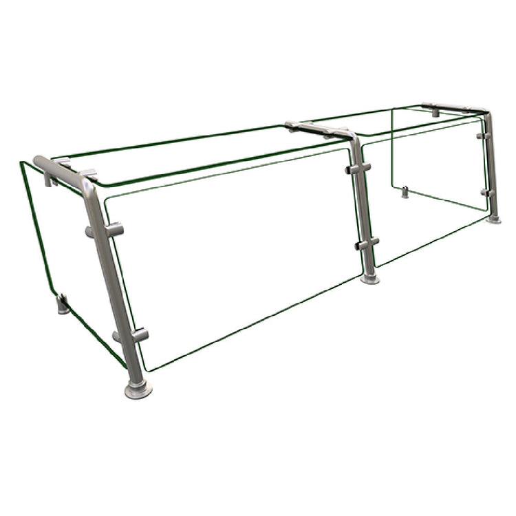 The Hatco EP21-06018 Flav-R-Shield® EP21 Food Shield is a full-service pass-over unit designed with precision and durability in mind, tailored for food service environments demanding stringent hygiene and presentation standards. This product features two bays each measuring 60 inches in width, 18 inches in depth, and 18 inches in height, providing ample space for showcasing culinary offerings. Constructed entirely from 1/4-inch thick heat-tempered glass, it ensures resilience and safety while enhancing visibility with its polished edges and 3/4-inch radius corners. The inclusion of a glass top shelf, along with front and side panels, facilitates an unobstructed view, enhancing the aesthetic appeal of displayed foods. Supporting this structure are 1-inch OD brushed 304 stainless steel posts, known for their strength and corrosion resistance, with the front posts uniquely tilted back to an 80-degree angle for ergonomic access. As an NSF component, it meets the necessary health and safety standards, making it a reliable choice for commercial kitchens. Proudly made in the USA, the Hatco EP21-06018 stands as a testament to quality craftsmanship and thoughtful design, catering to the needs of restaurants, catering services, and food display operations seeking a robust and attractive solution.