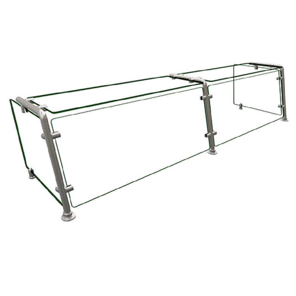 The Hatco EP21-07218 Flav-R-Shield® EP21 Food Shield is a meticulously engineered full-service pass-over unit designed for optimal food safety and presentation in professional food service environments. Measuring 72 inches in width, 18 inches in depth, and 18 inches in height, this unit features a robust 1/4-inch thick heat-tempered glass construction throughout, ensuring durability and safety. The design includes 3/4-inch radius corners and polished edges, enhancing its sleek appearance while minimizing the risk of injury. The glass top shelf is complemented by front and side panels, providing comprehensive protection and visibility of displayed food items. The sturdy framework is supported by 1-inch OD brushed 304 stainless steel posts, with the front posts uniquely tilted back to an 80-degree angle for a modern aesthetic and functional design. As an NSF component, this food shield meets rigorous health and safety standards, making it a reliable choice for restaurants, cafeterias, and catering services. Proudly made in the USA, the Hatco EP21-07218 Flav-R-Shield® EP21 Food Shield represents a blend of superior craftsmanship and innovative design, catering to diverse market segments seeking quality and reliability in food service equipment.