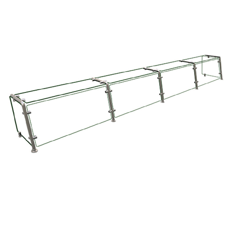The Hatco EP21-13215 Flav-R-Shield® EP21 Food Shield is a full-service pass-over unit designed with precision to meet the needs of diverse food service environments. This robust food shield features four bays, each measuring 132 inches in width, 15 inches in depth, and 18 inches in height, providing ample space for food presentation and service. Constructed entirely from 1/4-inch thick heat-tempered glass, it boasts 3/4-inch radius corners and polished edges, ensuring both durability and a sleek aesthetic. The unit is equipped with a glass top shelf, front, and side panels, all contributing to its transparent and clean design. Supporting this structure are 1-inch OD brushed 304 stainless steel posts, with the front posts uniquely tilted back to an 80-degree angle, enhancing both stability and visual appeal. As an NSF component, the Hatco EP21-13215 ensures compliance with public health standards, emphasizing its suitability for commercial use. Proudly made in the USA, this food shield is a testament to quality craftsmanship, making it an invaluable addition to restaurants, catering services, and buffet setups seeking a reliable and attractive solution for food display and safety.
