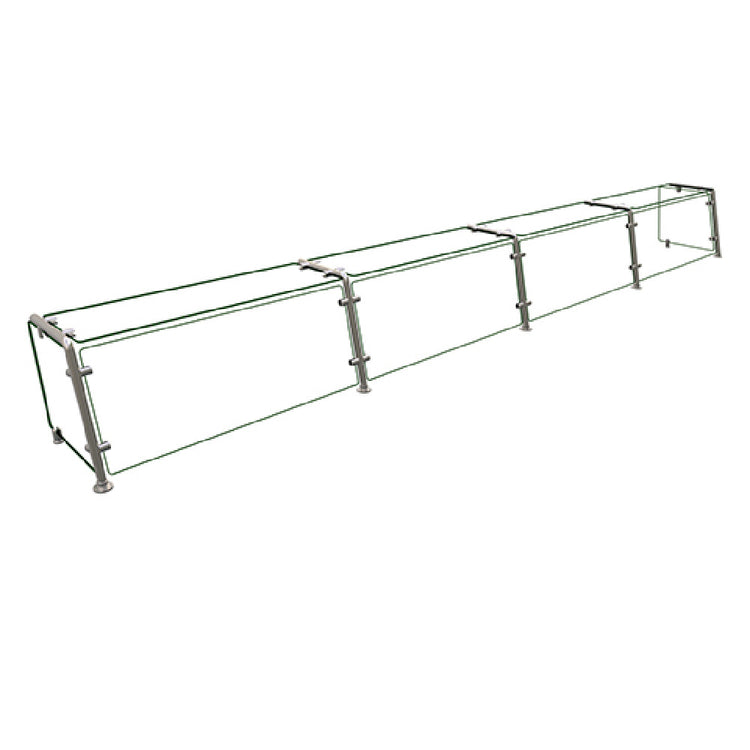 The Hatco EP21-14415 Flav-R-Shield® EP21 Food Shield is a full-service pass-over solution designed for optimal food display and protection, featuring four bays with dimensions of 144 inches in width, 15 inches in depth, and 18 inches in height. This unit is constructed entirely of 1/4-inch thick heat-tempered glass, offering durability and clarity, with 3/4-inch radius corners and polished edges to ensure safety and an elegant appearance. It includes a glass top shelf, front, and side panels, enhancing visibility while maintaining hygiene standards. The structure is supported by 1-inch OD brushed 304 stainless steel posts, with front posts tilted back to an 80-degree angle for ergonomic service access. Certified as an NSF component, this food shield meets rigorous public health and safety guidelines, making it a reliable choice for professional food service environments. Proudly made in the USA, the Hatco EP21-14415 is engineered to provide robust performance and aesthetic appeal, catering to the needs of various segments in the food service industry, from high-end restaurants to bustling cafeterias. Its thoughtful design and quality construction make it an essential addition for any establishment looking to combine functionality with sophisticated presentation.