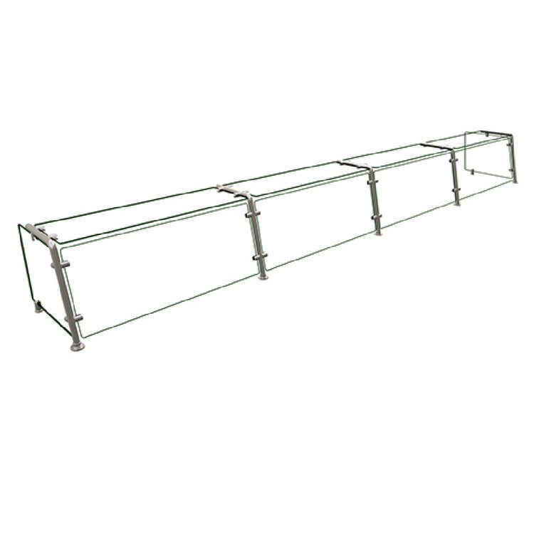 The Hatco EP21-14418 Flav-R-Shield® EP21 Food Shield is a full-service pass-over unit designed to enhance food service operations across various industry segments. With its expansive 4-bay configuration, the unit measures 144 inches in width, 18 inches in depth, and 18 inches in height, providing ample coverage for food presentation and protection. Crafted from 1/4-inch thick heat-tempered glass, it features 3/4-inch radius corners and polished edges, ensuring both durability and safety. The glass top shelf and the front and side panels enhance visibility while maintaining a sleek aesthetic. The structure is supported by 1-inch OD brushed 304 stainless steel posts, with the front posts artfully tilted back to an 80-degree angle for added stability and a modern look. As an NSF component, this food shield meets rigorous public health standards, assuring users of its quality and safety in high-demand environments. Made in the USA, the Hatco EP21-14418 stands out as a reliable and stylish solution for establishments such as restaurants, cafeterias, and catering services, where maintaining food integrity and presentation is paramount.