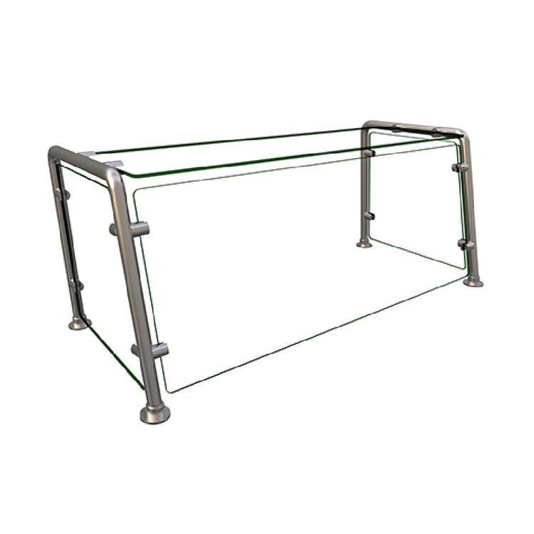 The Hatco EP22-03615 Flav-R-Shield® EP22 Food Shield is a full service pass-over unit, expertly crafted to meet the needs of various food service environments. It features a single bay design with dimensions of 36 inches in width, 15 inches in depth, and 18 inches in height, making it a compact yet functional addition to serving stations. The food shield is constructed entirely from 1/4 inch thick heat tempered glass, ensuring both durability and safety. Its design includes 3/4 inch radius corners and polished edges, adding an element of refinement and reducing the risk of injury. This model is equipped with a glass top shelf, as well as front and side panels, all supported by back posts for structural integrity. The 1 inch outer diameter brushed 304 stainless steel posts offer a sleek, professional aesthetic, with the front posts designed to tilt back at an 80 degree angle, optimizing visibility and access. Additionally, the Hatco EP22-03615 is an NSF component, signifying its compliance with stringent health standards, and it is proudly manufactured in the USA. This food shield is a practical and reliable solution for ensuring food safety and presentation across diverse food service sectors.