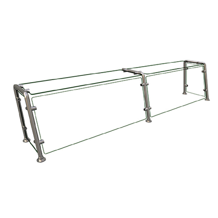 The Hatco EP22-07212 Flav-R-Shield® EP22 Food Shield is a full-service pass-over unit designed to meet high standards of safety and functionality in the food service industry. With two bays measuring 72 inches in width, 12 inches in depth, and 18 inches in height, this food shield is built to accommodate a wide range of service setups. Its construction features 1/4-inch thick heat-tempered glass throughout, ensuring durability and safety. The glass components include a top shelf, front, and side panels, all crafted with 3/4-inch radius corners and polished edges for a sleek appearance and enhanced safety. The unit is supported by 1-inch OD brushed 304 stainless steel posts, known for their strength and corrosion resistance, with the front posts tilted back at an 80-degree angle to optimize visibility and access. As an NSF component, this food shield adheres to strict standards of public health protection, making it a reliable choice for any food service operation. Proudly made in the USA, the Hatco EP22-07212 Flav-R-Shield® EP22 Food Shield is an exemplary blend of design, safety, and quality, tailored for diverse applications in the food service industry.