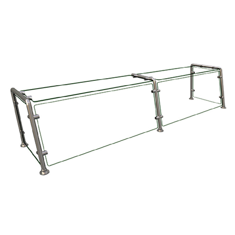 The Hatco EP22-07215 Flav-R-Shield® EP22 Food Shield is a full-service pass-over unit featuring a robust design with two bays measuring 72 inches in width, 15 inches in depth, and 18 inches in height. Constructed entirely from 1/4-inch thick heat-tempered glass, it provides durability and safety with 3/4-inch radius corners and polished edges. The unit includes a glass top shelf along with front and side panels that are supported by back posts. Additionally, the food shield is built with 1-inch OD brushed 304 stainless steel posts, with the front posts angled back at an 80-degree slope for ergonomic design and efficiency. As an NSF certified component, this product adheres to stringent public health and safety standards, promoting a high level of trust in professional kitchen environments. Proudly made in the USA, the Flav-R-Shield® EP22 Food Shield is ideal for a variety of food service settings, offering a blend of structural strength and visual appeal. Its precise engineering and quality materials make it a valuable component for enhancing both the functionality and aesthetics of food presentation and service areas.