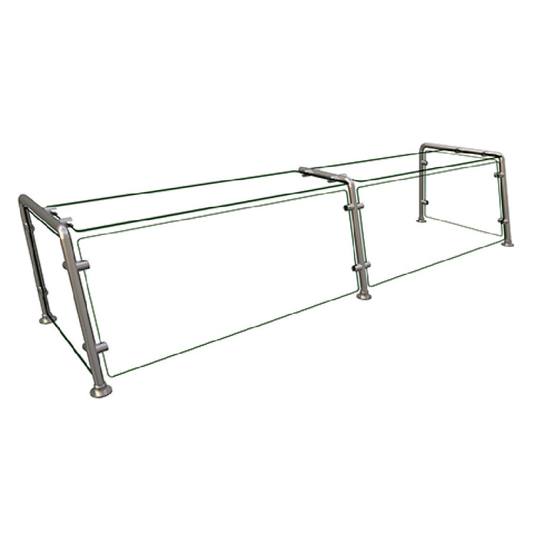 The Hatco EP22-07218 Flav-R-Shield® EP22 Food Shield is a full-service pass-over unit designed for optimal functionality and durability. It features a robust construction with 1/4-inch thick heat-tempered glass, providing both clarity and strength. The unit's dimensions are 72 inches in width, 18 inches in depth, and 18 inches in height, making it suitable for various commercial food service settings. The Flav-R-Shield® includes two bays, each framed with 3/4-inch radius corners and polished edges, ensuring safety and elegance in busy environments. The glass top shelf, along with the front and side panels, are supported by sturdy back posts. The front posts are uniquely tilted back to an 80-degree angle, enhancing the visibility and accessibility of displayed food items. Constructed with 1-inch OD brushed 304 stainless steel posts, this food shield promises longevity and resistance to wear. As an NSF component, it meets stringent standards for health and safety, making it an ideal choice for environments that demand high levels of cleanliness and reliability. Proudly made in the USA, the Hatco EP22-07218 Flav-R-Shield® EP22 Food Shield is perfect for businesses seeking a dependable and sophisticated solution for food presentation and protection.