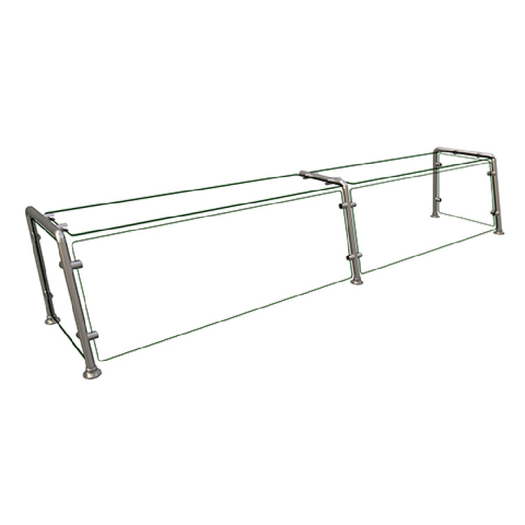 The Hatco EP22-08415 Flav-R-Shield® EP22 Food Shield is a full service pass-over designed to enhance food service operations with precision and style. This model, structured with 1/4" thick heat-tempered glass, offers durability and safety, making it ideal for settings that require robust protection and clear visibility of food items. The shield features two bays with dimensions of 84"W x 15"D x 18"H, providing ample space for display and service. Its 3/4" radius corners and polished edges add a sleek finish, while the glass top shelf enhances usability and accessibility. The surrounding front and side panels, supported by 1" OD brushed 304 stainless steel posts, contribute to the product's sturdy construction. The front posts are tilted back to an 80-degree angle, optimizing the viewing angle and ease of service. Certified as an NSF component, this product ensures adherence to public health standards. Proudly made in the USA, the Hatco EP22-08415 is a reliable choice for various market segments within the food service industry, offering a combination of aesthetic appeal and practical functionality for any full-service dining environment.