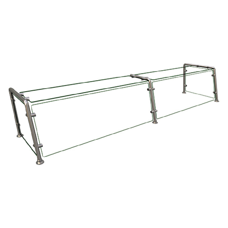 The Hatco EP22-08418 Flav-R-Shield® EP22 Food Shield is a full-service pass-over unit with two bays, measuring 84 inches wide, 18 inches deep, and 18 inches high. This food shield is expertly crafted with 1/4 inch thick heat-tempered glass, ensuring durability and safety. Its design features 3/4 inch radius corners and polished edges, contributing to a sleek and professional appearance. The unit includes a glass top shelf, front and side panels, and back posts, all supported by 1 inch OD brushed 304 stainless steel posts. The front posts are uniquely angled back to an 80-degree angle, enhancing the unit's stability and aesthetic appeal. Certified as an NSF component, it meets stringent public health and safety standards, making it suitable for various food service environments. Proudly made in the USA, the Hatco EP22-08418 Flav-R-Shield® EP22 Food Shield is a versatile and reliable choice for businesses seeking to maintain high standards of food presentation and protection. Its robust construction and thoughtful design cater to the needs of different segment markets within the industry, ensuring both functionality and elegance in any professional kitchen or food service setting.