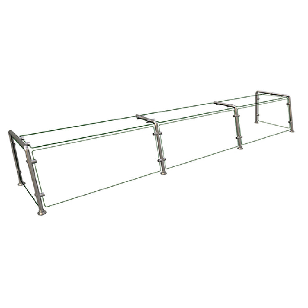 The Hatco EP22-10818 Flav-R-Shield® EP22 Food Shield is a meticulously designed full-service pass-over unit, featuring a comprehensive three-bay layout with dimensions of 108"W x 18"D x 18"H. Engineered for durability, it boasts a 1/4" thick heat-tempered glass construction throughout, complemented by 3/4" radius corners and polished edges for safety and aesthetic appeal. The unit includes a glass top shelf along with front and side panels, providing ample space and visibility for showcasing food items. An innovative design feature includes back posts and front posts that are tilted back to an 80-degree angle, optimizing the display and accessibility of food. Constructed with 1" OD brushed 304 stainless steel posts, it ensures robust support and longevity, suitable for high-demand environments. Recognized as an NSF component, this food shield meets stringent public health standards, affirming its suitability for diverse market segments within the foodservice industry. Proudly made in the USA, the Hatco EP22-10818 Flav-R-Shield® seamlessly combines functionality with a sophisticated, sleek design, making it an excellent choice for establishments looking to enhance their service efficiency while maintaining high display standards.