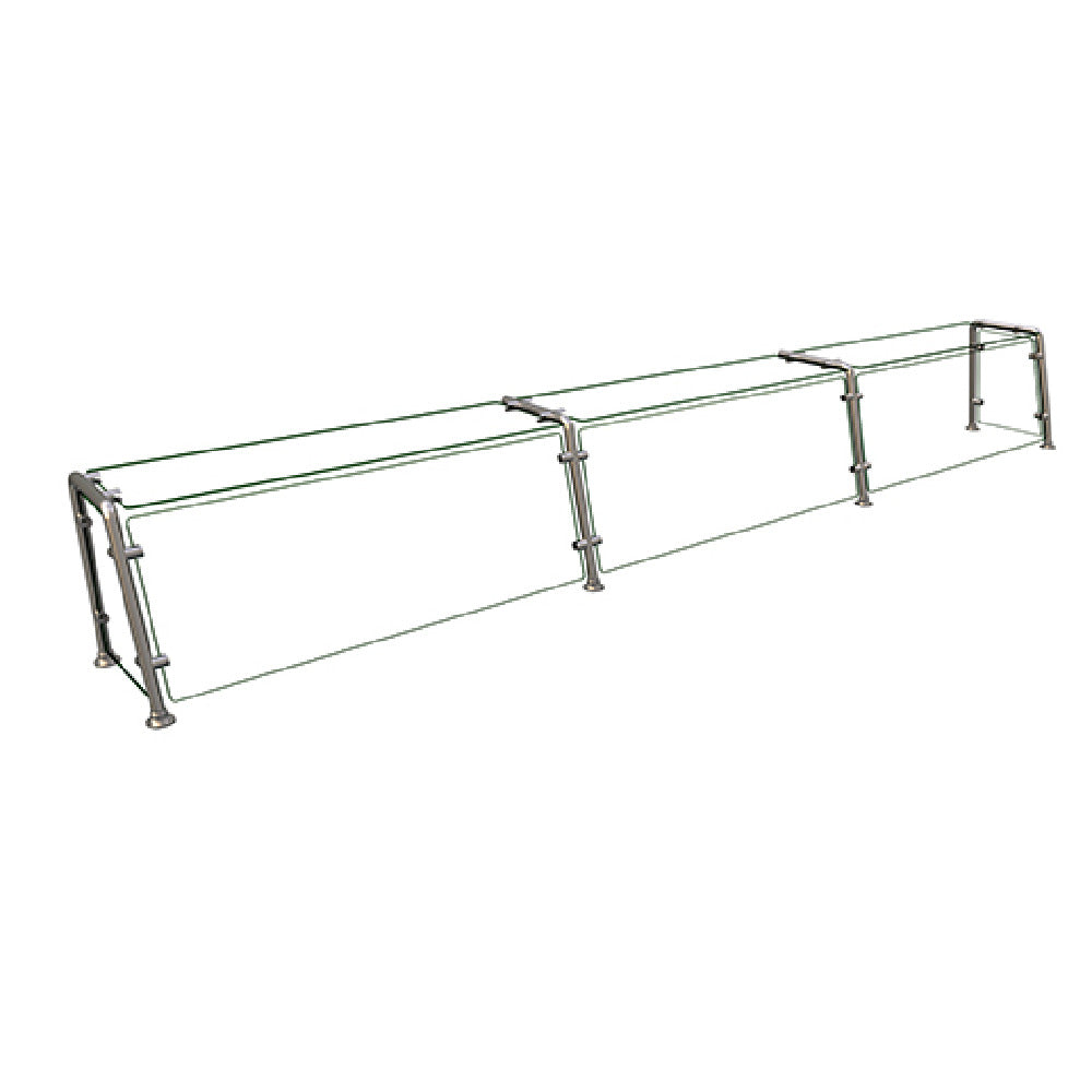 The Hatco EP22-12012 Flav-R-Shield® EP22 Food Shield is a meticulously engineered full service pass-over unit featuring three bays that measure 120 inches in width, 12 inches in depth, and 18 inches in height. This product is constructed with 1/4-inch thick heat-tempered glass throughout, ensuring durability and safety, complemented by 3/4-inch radius corners and polished edges for a sleek finish. The unit includes a glass top shelf, as well as front and side panels, supported by back posts for structural integrity. Stylish yet strong, the design is supported by 1-inch outer diameter brushed 304 stainless steel posts, with the front posts tilted back at an 80-degree angle, enhancing its modern aesthetic while maintaining functionality. Its NSF component certification signifies compliance with high public health and safety standards. Made in the USA, the Hatco EP22-12012 is a stellar choice for food service industries requiring a reliable and stylish food shield. This product is particularly suited for environments such as catering businesses, restaurants, and hotels where both functionality and presentation are valued, providing a clear and protected display of food items while maintaining ease of access for service staff.