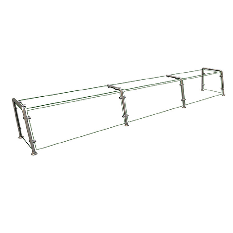 The Hatco EP22-12015 Flav-R-Shield® EP22 Food Shield is a meticulously engineered full-service pass-over unit, featuring three bays with dimensions of 120 inches in width, 15 inches in depth, and 18 inches in height. This product is constructed with 1/4-inch thick heat-tempered glass throughout, ensuring durability while maintaining a sleek appearance. The design incorporates 3/4-inch radius corners and polished edges for enhanced safety and aesthetic appeal. The inclusion of a glass top shelf, along with front and side panels supported by robust back posts, further underscores its functional design. The unit is built with 1-inch outer diameter brushed 304 stainless steel posts, known for their strength and resistance to corrosion. Additionally, the front posts are innovatively tilted back at an 80-degree angle for improved functionality. Proudly made in the USA, this food shield is NSF component certified, meeting rigorous public health and safety standards. The Hatco EP22-12015 Flav-R-Shield® EP22 is an essential asset across various segments of the food service industry, providing a reliable solution for establishments demanding premium quality and performance in their food display and service operations.
