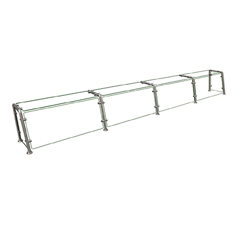 The Hatco EP22-13212 Flav-R-Shield® EP22 Food Shield is a full-service pass-over unit expertly crafted for optimal performance in food service environments. With dimensions of 132"W x 12"D x 18"H, this unit features a 1/4" thick heat-tempered glass construction, ensuring both durability and safety. The design incorporates 3/4" radius corners and polished edges, enhancing aesthetic appeal and user safety. Its glass top shelf, along with front and side panels, are supported by sturdy back posts. The food shield is built with 1" OD brushed 304 stainless steel posts, providing a robust framework. The front posts are innovatively tilted back to an 80-degree angle, optimizing visibility and access for service staff. As an NSF component, the Hatco EP22-13212 meets stringent public health and safety standards, making it a reliable choice for restaurants, cafeterias, and other food service operations. Proudly manufactured in the USA, this food shield combines structural integrity with sleek design, making it a valuable asset in maintaining hygiene and enhancing the presentation of food offerings across various market segments within the food industry.