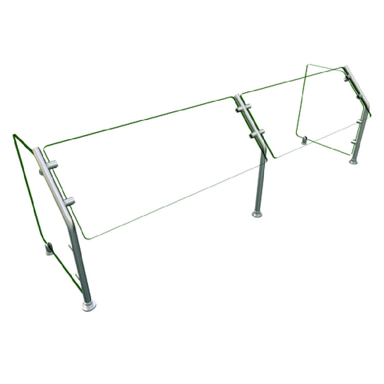The Hatco ES31-72 Flav-R-Shield® ES31 Food Shield is a precision-engineered self-service unit measuring 72 inches in width, 18 inches in depth, and 22 inches in height. Constructed entirely from heat-tempered glass, this product stands out with 3/4-inch radius corners and polished edges, ensuring both durability and a sleek finish. The glass top shelf is 3/8 inch thick, while the front and side panels utilize 1/4-inch thick glass, providing sturdy protection for displayed food items. Supporting the structure are 1-inch outer diameter brushed 304 stainless steel posts, contributing to the shield's robust and hygienic design. As an NSF component, it adheres to stringent public health and safety standards, making it a reliable choice for various food service environments, including cafeterias, buffets, and self-service stations. Proudly made in the USA, the Hatco ES31-72 Flav-R-Shield® offers a sophisticated blend of functionality and aesthetics, catering to the operational needs of diverse market segments within the food service industry. This product not only enhances the presentation of food but also integrates seamlessly into any setting, providing a visually appealing and practical solution for food protection and display.