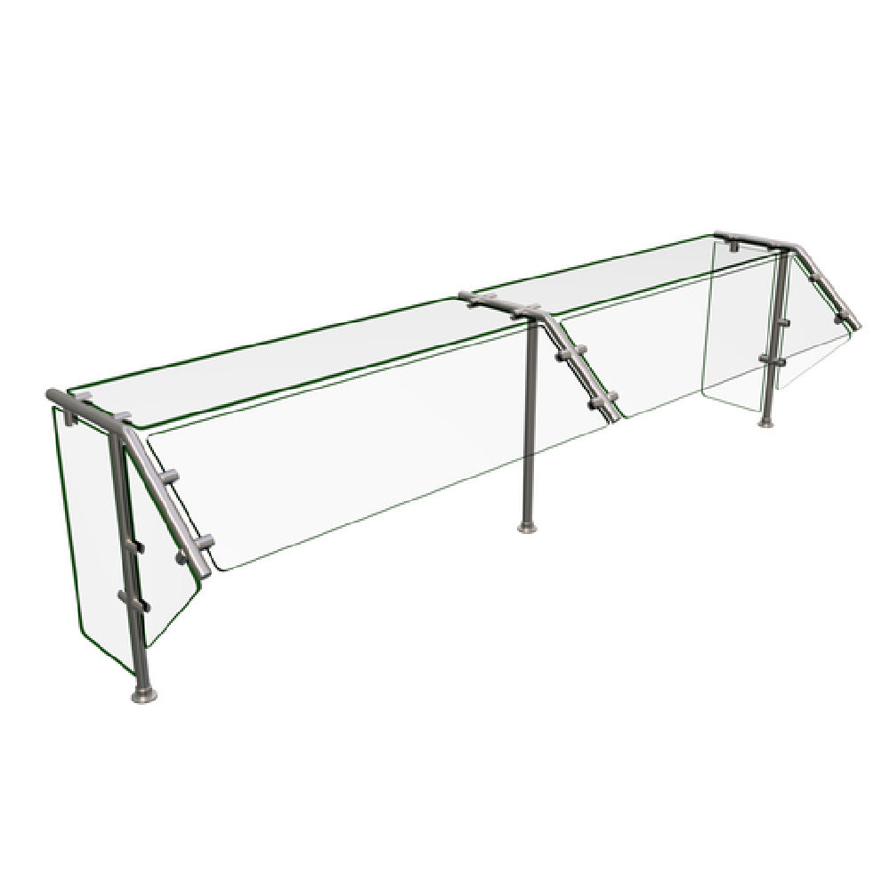 The Hatco ES40-84 Flav-R-Shield® ES40 Food Shield is a self-service unit designed for maximum functionality and durability in food service environments. Measuring 84 inches in width, 20 inches in depth, and 24 inches in height, this product offers ample space across its two bays for a variety of food presentation needs. Constructed with heat-tempered glass throughout, it features 3/4-inch radius corners and polished edges, ensuring both safety and aesthetic appeal. The glass top shelf, front, and end panels are made from 1/4-inch thick glass, emphasizing its robust design. Supported by 1-inch OD brushed 304 stainless steel posts, the structure is both sturdy and visually appealing. As an NSF component, the Hatco ES40-84 ensures compliance with public health standards, making it ideal for use in restaurants, cafes, and other service areas that prioritize hygiene and efficiency. Proudly manufactured in the USA, this food shield integrates quality construction with refined design, catering to various market segments within the food service industry. Whether for buffet lines, self-service stations, or display counters, the Hatco ES40-84 provides reliable protection and an attractive presentation platform, aligning with professional standards and enhancing customer experience.